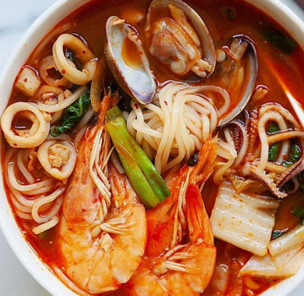 Signature korean spicy noodles soup loaded with flavors of pork, seafood, and vegetable broth.